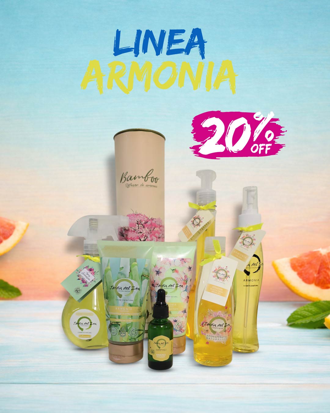 ¡Disfruta de un 20% de descuento en toda nuestra Línea Armonía! Incluye exfoliantes, cremas, aceites para masajes, burbujas, fragancias, sprays aromatizadores ¡y mucho más! Lleva bienestar a tu día con nuestras ofertas especiales.